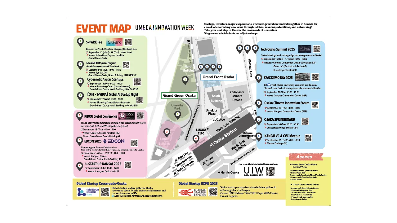 「梅田イノベーションウィーク」は、複数の会場で多数のセッションが同時進行する、非常に複雑な構成のイベントです。参加者がストレスなく目的のプログラムにたどり着くためには、直感的で分かりやすい情報提供が不可欠です。