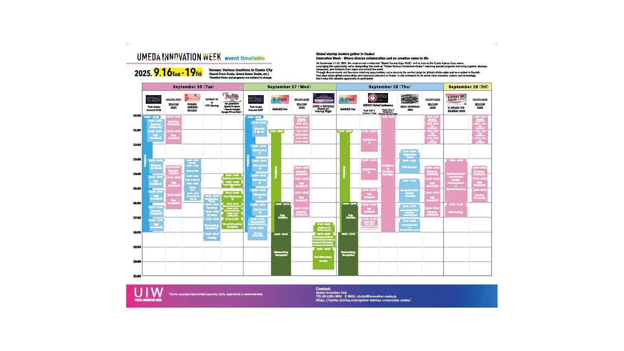 「梅田イノベーションウィーク」は、複数の会場で多数のセッションが同時進行する、非常に複雑な構成のイベントです。参加者がストレスなく目的のプログラムにたどり着くためには、直感的で分かりやすい情報提供が不可欠です。